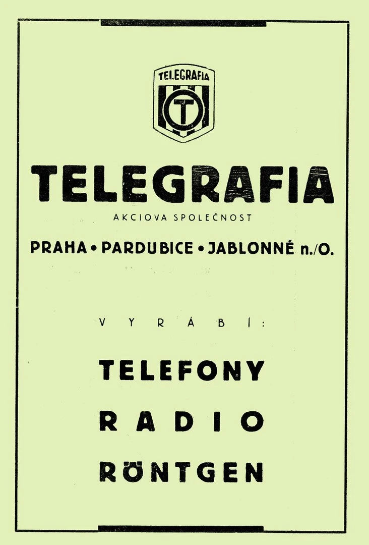 „Telegrafia, československá továrna na telefony a telegrafy a.s.“ bola založená 18. októbra 1919 v Prahe so 60 % účasťou štátu. V roku 1922 sa spoločnosť presťahovala do Pardubíc, kde pôsobila až do začlenenia pod národný podnik Tesla. Firma vyrábala predovšetkým telefónne prístroje, telegrafy, telefónne ústredne vrátane potrebných súčiastok a komplexne zabezpečovala budovanie telefónnej siete. Okrem toho tu vyrábali aj NF techniku (rádioprijímače, zosilňovače) a medicínske prístroje. Ich výrobky boli označované symbolom písmena T. (Telegrafia – babička Tesly) Potom Tesla Pardubice.
