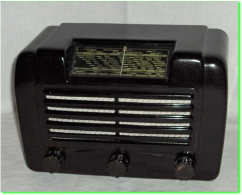 Bakelitová čierna skrinka, sklenená stupnica, okrúhly reproduktor 100 mm s permanentným magnetom, 4Ohm, výstupný výkon 1,5 W pri 220 V
